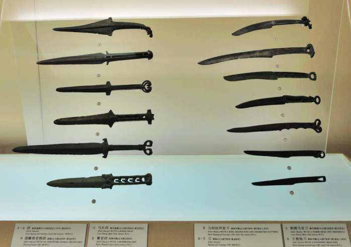 【商代--春秋】青铜刀剑:按现在出土文物来看,最早的剑产生在商代,较短,呈柳叶或锐三角形,初为铜制,无格短柄,只能算是自卫武器。